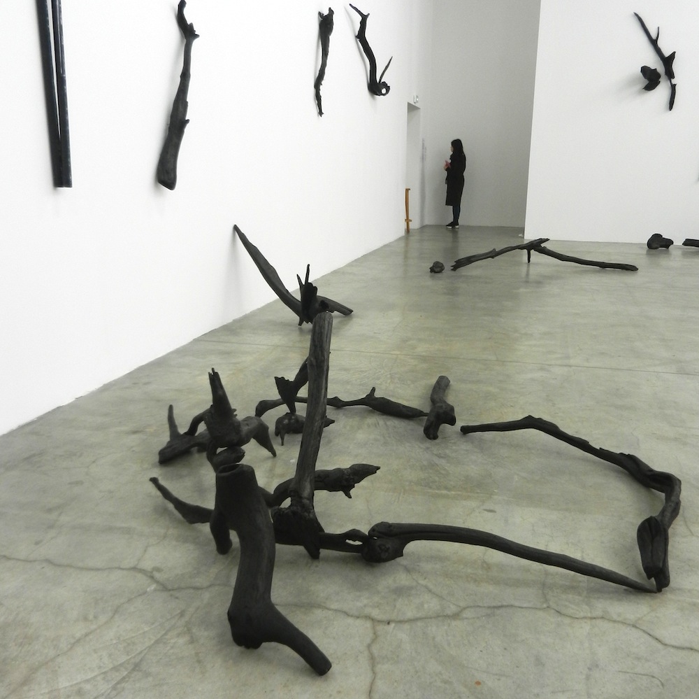 À travers « Round Midnight », nouvel ensemble d’œuvres spécifiquement conçu pour cette exposition, l’artiste rend hommage au standard de jazz éponyme composé par Thelonious Monk. En référence au célèbre style d’improvisation du pianiste, la sculpture échappe à ses contraintes pour devenir un geste libre et spontané ; elle se mue en un dessin dans l’espace, à l’échelle du lieu. Des correspondances poétiques se tissent entre la transparence du verre et le bois sculpté, le bitume ou encore l’encre séchée, dont l’obscurité renvoie à la nuit de l’âme.