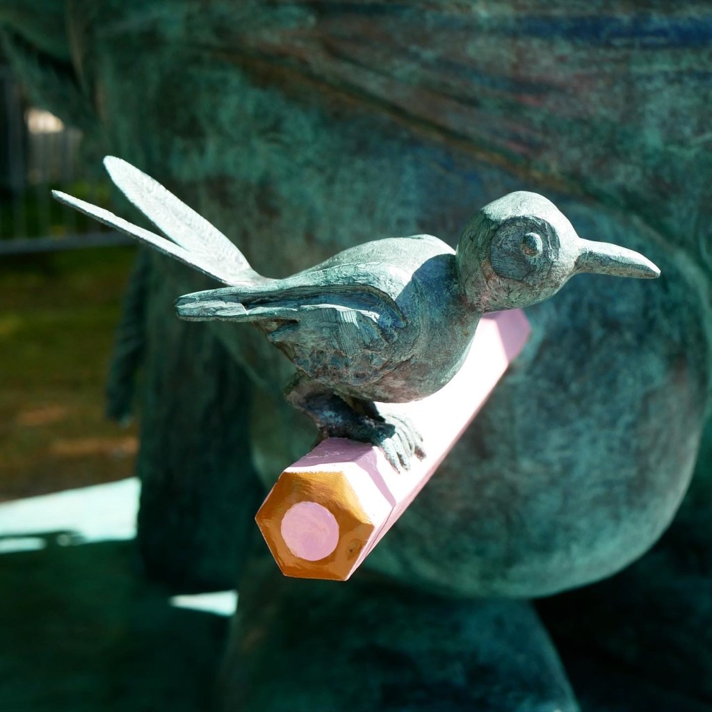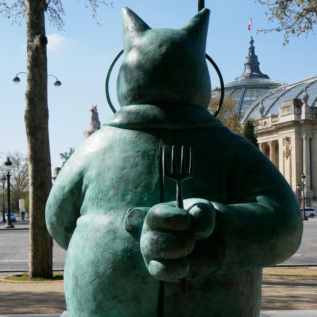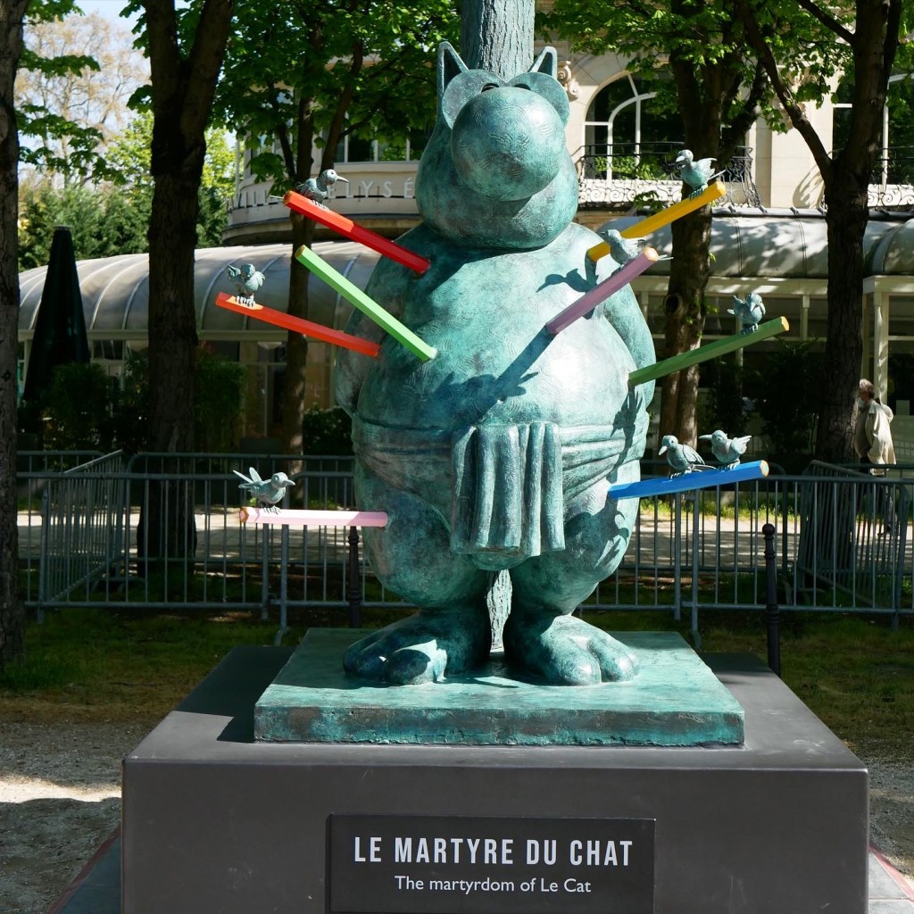 Dans Tutu et Grominet, le Chat se glisse dans la peau d’une ballerine pour effectuer un grand battement à la manière de La Danseuse à la barre de Fernando Botero. Le célèbre félin s’inspire également de la sculpture gréco-romaine Atlas, portant sur ses épaules le globe céleste composé de bouteilles en plastique. Un peu plus loin, un autre Chat est le martyr de Saint-Sébastien transpercé de crayons, hommage aux artistes persécutés et notamment aux victimes de l’attentat de Charlie Hebdo.